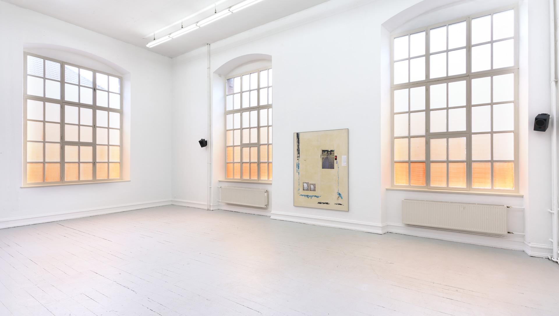 In recent years, severe forest fires across Canada, North America, and Europe have turned the sky increasingly orange. Over five days, I painted the windows of Room 123 at the Kunstakademie Düsseldorf to approximate this phenomenon. Like a sunset, fine particles from the fires refract sunlight into layered shades of orange — a colour I sought to render with buttermilk, soy yoghurt and food colouring. An orange that will grow richer with every passing year.